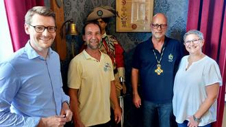 Stadtbürgermeister Günter Goß (2. v. l.) die erste Stadtbeigeordnete Claudia Wolf (r.) und Stadtbeigeordneter Markus Fischer (l.) gratulierten dem pankgräftlichen Statthalter Stefan Weber und beglückwünschten die Vereinigung zu deren neuen Remter im Braubacher Rathaus.
