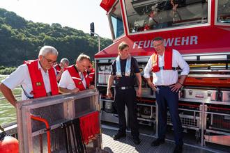 Auf Einladung des Bürgermeisters der Verbandsgemeinde (VG) Loreley, Mike Weiland, war der rheinland-pfälzische Ministerpräsident Alexander Schweitzer jetzt bei der Feuerwehr St. Goarshausen auf dem landeseigenen Hilfeleistungslöschboot (HLB) „Loreley“ zu Gast, um sich von der Technik und den Möglichkeiten des Bootes, aber vor allem auch dem Engagement und der Einsatzbereitschaft der Feuerwehrkameraden, die sie im Ehrenamt erbringen, persönlich zu überzeugen. „Mit dem HLB haben wir ein starkes Zeichen für Sicherheit und Zusammenhalt in Rheinland-Pfalz gesetzt. Denn der Brand- und Katastrophenschutz ist eine tragende Säule der inneren Sicherheit in unserem Land. Die Anschaffung und der Betrieb dieses hochmodernen Bootes zeigen, wie Land, Kommune und unsere ehrenamtlichen Einsatzkräfte Hand in Hand arbeiten, um die Resilienz unserer Region nachhaltig zu stärken. Als Landesregierung ist es unsere Pflicht und unser Bekenntnis, die Einsatzfähigkeit und Ausstattung unserer Feuerwehren zu sichern, das Ehrenamt zu fördern und zu würdigen“, so Ministerpräsident Schweitzer.