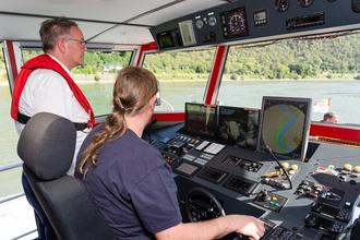 Während einer Übungsfahrt von Kaub zur Loreley und zurück zeigte Samuel Rein, stellvertretender Wehrführer der 40 Mann starken Feuerwehreinheit St. Goarshausen das Können des HLB, das 2019 beschafft wurde. Angetrieben wird es von zwei Motoren mit insgesamt 1.600 PS, die es zu Berg auf mehr als 40 km/h und rheinabwärts auf weit über 60 km/h beschleunigen können. „Da muss man sich schon mit anderen Bootsführern auf dem Rhein wegen des Wellenschlags verständigen“, grinst Samuel Rein. Man wolle ja schließlich als Retter niemanden anderen unnötig in Gefahr bringen. Mit einer Länge von nur 15 Metern und 5,10 Meter Breite hat das HLB einen Tiefgang von 0,80 Meter bei einer lichten Durchfahrtshöhe von 4,65 Meter. Das Einsatzgewicht beträgt 29 Tonnen. Vor allem auf dem Abschnitt zwischen Bingen und Koblenz kommt das Boot zum Einsatz und bietet mit samt der Besatzung, an diesem Tag neben Samuel Rein mit Matthias Maus und Ralf Reckermann komplettiert, ein starkes Stück Sicherheit auf dem Rhein.