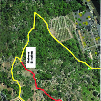 Der obere Einstieg befindet sich am südwestlichen Ende des auf der Grafik abgebildeten Weinberges und ist vor Ort gut an den zwei dort befindlichen Ruhebänken zu erkennen.