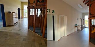 Hierbei ging es vor allem um den Austausch der Flurdecke und des Flurbodens, der kompletten Sanierung des Personal-WCs, dem Austausch von Innentüren, dem Abriss des nicht mehr funktionsfähigen Kachelofens, ausbessern und streichen der Wände in den genannten Räumen und der Installation einer der VDE entsprechenden Elektroinstallation in den Büroräumen.