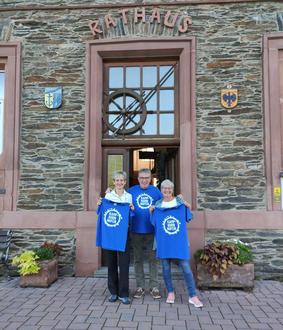 Loreley-Touristik-Geschäftsführerin Ulrike Dallmann, Ortsbürgermeister Frank Kalkofen und TI-Mitarbeiterin Petra Kahl präsentieren die neuen T-Shirts