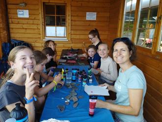 Der nächste Morgen startete zur Freude der Betreuer, in diesem Jahr gar nicht mal so früh. Erst um 6:30 Uhr waren die ersten Kinder aus den Zelten und es ging sofort wieder los, die Natur zu erkunden. Nach dem gemeinsamen Wecken stand dann das Frühstück schon bereit. Hierzu hatte sich das Küchenteam gut organisiert und frische Brötchen und alles Weitere bei unserem „Dorfladen Osterspai“ besorgt. Nach einer „Guten-Morgen-Runde“ fanden die Workshops statt. Viele Helfer waren hierzu zeitweise auf die Florianshütte gekommen, um das Kernteam der Leiterrunde zu unterstützen. Beim Lederbasteln, Stanzen eines Lagerbuttons, Flechten von Haarbändern, Steine bemalen, Bauen von Musikinstrumenten, Feuermachen und dem Bemalen der Lagerflagge hatten alle viel Spaß und die Zeit verging wie im Flug. Für den Workshop „Zwergfledermäuse“ konnte Herr Stefan Eschenauer vom Naturpark Nassau wiedergewonnen werden. Gemeinsam schaute man in die Nistkästen vom letzten Jahr an. Mit Leiter und Werkzeug ausgestattet wurden weitere Nistkästen im Umkreis der Florianshütte an Bäumen befestigt.