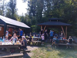 Zum Nachmittag trafen die Kleingruppen glücklich wieder am Lagerplatz ein. Zur Stärkung gab es leckeren Streuselkuchen aus dem Dorfladen. Und schon wieder hieß es für die Kinder nach Herzenslust im Wald toben oder mit dem eigenen Taschenmesser Stöcke am Lagerfeuer schnitzen. So manchen Betreuer zog es absolut mit ins Spiel der Kinder, bis man vor lauter Dunkelheit den Ball nicht mehr sehen konnte. Zum Abendessen wurde der Grill angefeuert und wir ließen uns Würstchen, Steak und Grillkäse, sowie von den Eltern beigesteuerte Salate schmecken.