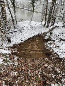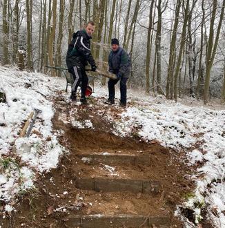 Dabei konnten am vergangenen Samstag trotz winterlicher Verhältnisse viele in den vergangenen Wochen umgefallene Bäume klein gesägt werden. Auch mit dem Bau einer neuen Treppe für einen weiteren Aussichtspunkt wurde begonnen. Was hier wohl 2023 entstehen wird? Man darf gespannt sein.