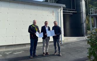 Werkleiter Michael Krämer, Präsident der Struktur- und Genehmigungsdirektion (SGD) Nord Wolfgang Treis und Bürgermeister Mike Weiland an der Kläranlage in Kestert. Foto: SGD Nord