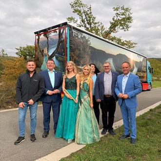 Es ist ein sehr schöner Werbeträger für das Tal der Loreley, der künftig mit dem Loreley-Felsen, dem Rheintal und auch der Loreley-Repräsentantin auf den Seiten und am Heck des Aufliegers durch die Lande fährt. Gemeinsam mit dem Vorsitzenden des Vereins Loreley-Touristik e.V., Marcus Fetz, der scheidenden Loreley Katharina, der neuen Loreley Selina, Landrat Jörg Denninghoff und Reitzenhains Ortsbürgermeisterin Obel nahmen Bürgermeister Mike Weiland und Prokurist Stefan Himmighofen das Fahrzeug unter die Lupe. "Ich bin überzeugt, dass dies im besten Sinne Werbung für unsere Heimat ist und Menschen einlädt, zu uns zu kommen", so Mike Weiland. Man könne für solche Dinge nur dankbar sein, denn der LKW trägt auch den Schriftzug Mythos. Momente. Mittelrhein. sowie den Begriff Faszination Loreley, den die Loreley Touristik GmbH auch als Slogan prägt. Es bleibt zu erwähnen, dass dies bereits der zweite Truck ist, den die Spedition Heuser für das Welterbe Mittelrheintal aufgelegt hat - ein tolles Engagement für die Verbandsgemeinde Loreley und das Rheintal insgesamt.