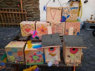 Im Rahmen der Aktion „Grüne Verbandsgemeinde Loreley“ fand ein weiterer Aktionstag statt. Diesmal war das Kinder- und Jugendbüro zu Gast bei dem Verein „Wald und Wiese“ in Dachsenhausen. Zehn Kinder waren vor Ort und freuten sich auf das gemeinsame Bauen und Gestalten von Wildbienenhäusern und Nistkästen. Zu Beginn der Aktion gab es zunächst eine kleine theoretische Einführung in das Thema. Es ging unter anderem um Fragen wie: Was sind Wildbienen und warum sind sie so wichtig für uns? Für welche Vögel sind die Nistkästen? Nachdem alle Fragen geklärt waren ging es an die Arbeit. Mit viel Engagement und Interesse wurden so acht Wildbienenhäuser und zwei Nistkästen gebaut und individuell gestaltet. Es wurde gebohrt, gemalt, geklebt, gehämmert und geschraubt. Perlenketten, Muscheln und Federn wurden angebracht und auch der Brandstempel mit dem Wappen der Verbandsgemeinde Loreley durfte natürlich nicht fehlen. So verging die Zeit wie im Flug. Es dämmerte bereits als die Aktion erfolgreich beendet wurde. Die Behausungen für Wildbienen und die Nistkästen wurden im Anschluss an die gemeinsame Aktion in und um Dachsenhausen verteilt. Jetzt können die neuen Bewohner einziehen und die Kinder haben die Möglichkeit bei einem Spaziergang nach ihren Bauwerken zu schauen. Am Ende waren sich alle einig: Die gemeinsame Aktion hat allen sehr viel Spaß gemacht.