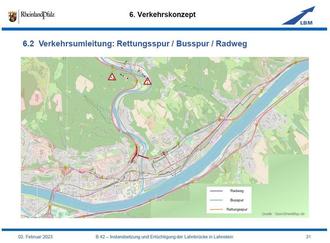 • Baubeginn mit vorlaufenden baulichen Maßnahmen in Lahnstein ab September 2023, • Einrichtung der Verkehrsführung in Lahnstein in den Herbstferien 2023, • Aktivierung der Verkehrsführung in Lahnstein nach den Herbstferien 2023, • Sanierung Anschlussast von der B 260 auf die B 42 ab Oktober 2023 bis Dezember 2023, • Vollsperrung der B 42 aktiv ab Januar 2024 für 12 Monate