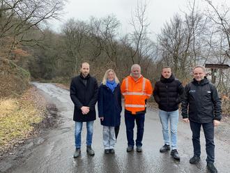 Die Auftragsvergabe steht an. Nach zufriedenstellenden Ausschreibungsergebnissen kann die Sanierung des Wirtschaftswegs Osterspai-Kamp-Bornhofen inklusive Verlegung einer neuen, zusätzlichen Wasserleitung zur langfristigen Sicherstellung der Versorgung der Rheingemeinden um Ostern wie geplant starten. Beim Vor-Ort-Termin mit dabei (v.l.n.r.) Ortsbürgermeister Sven Faber, Beigeordnete Lene Lewentz, Werkleiter Michael Krämer, Ortsbürgermeister Sebastian Reifferscheid, Bürgermeister Mike Weiland. Foto: VG Loreley, Mike Weiland