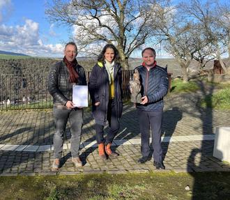 Nach der Vertragsunterzeichnung zur Schaffung der neuen Loreley-Statue für den Kultur- und Landschaftspark ging es an Ort und Stelle des neuen Standortes, mit dabei (v. r. n. l.) Armin Schaust, Künstlerin Valerie Otte und Bürgermeister Mike Weiland hier mit dem Sieger-Modell der später etwa 2,20 Meter hohen neuen Bronze-Statue. Foto: VG Loreley, Matthias Zulauf