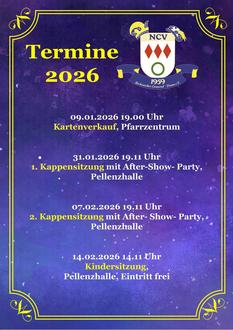 Der Nickenicher Carneval-Verein 1959 e. V. freut sich, den Kartenverkauf für die mit Spannung erwarteten Kappensitzungen der Session 2026 anzukündigen.
