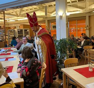 Die diesjährige Nikolausandacht der Barmherzigen Brüder Saffig stand unter dem Motto „Seht und staunt, wie freundlich Gott ist“. Im festlich geschmückten Café „Zum Schänzchen“ versammelten sich viele Klientinnen und Klienten, um dem Leben des heiligen Nikolaus zu gedenken. Im Mittelpunkt der von Karin Kinzig (Seelsorgerin) und Jörg Hoffmann (Leiter der Landschaftspflege und Diakon) gestalteten Andacht stand die Erzählung über das „Kornwunder“. Diese besagt, dass Nikolaus in einer Hungersnot für die sichere Lieferung von Korn betete und somit die hungernde Bevölkerung rettete. Jörg Hoffmann erweckte die Geschichte im Gewand des heiligen Bischofs von Myra auf eindrucksvolle Weise zum Leben. Beim anschließenden gemeinsamen Singen von bekannten Nikolaus- und Adventsliedern stimmten alle begeistert mit ein. Abgerundet wurde der Gottesdienst durch ein von Markus Eichelbeck (Beschäftigter in der Landschaftspflege) vorgetragenes Gedicht, das die Bedeutung von Nächstenliebe und Hoffnung in der Adventszeit betonte. Die Feier fand ihren Ausklang bei Kaffee und Kuchen in geselliger Runde und steigerte die Vorfreude auf das nahende Weihnachtsfest.