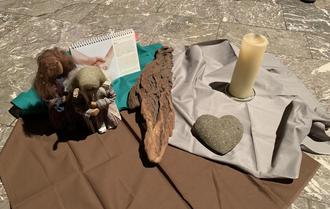 Biblische Erzählfiguren und ein Fastenkalender mit einem Abschnitt aus dem Buch Ruth waren als gestaltete Mitte beim Treffen des Bibelkreises dabei.