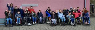 Die Klasse 3c übt sich im Rollstuhl fahren
