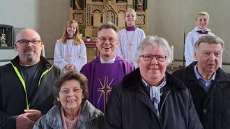PGR Mitglieder vor und hinter der Kamera sowie Ministranten: Joachim Praml, Anni Boos, Monika Leinz, Pfarrer Norbert Missong, Lara Ducht, Elisabeth und Horst Schmitz und Felix Meister. Hans-Werner Degen war entschuldigt und Cornelia Praml fotografierte.