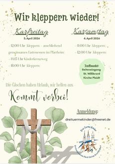 In diesem Jahr bieten die Drei-Türme-Kinder in Plaidt erstmals eine gemeinsame Klepperaktion für Kinder an. Alle Interessierten sind eingeladen, sich anzuschließen und gemeinsam durch die Straßen zu ziehen.