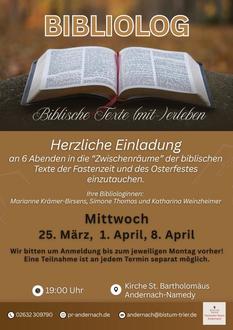Wir treffen noch einmal am 01.04. und 08.04.2026 jeweils um 19:00 Uhr in der Kirche St. Bartholomäus in Andernach-Namedy. Die einzelnen Abende werden angeleitet von den ausgebildeten Bibliologinnen Marianne Krämer-Birsens, Simone Thomas oder Katharina Weinzheimer. Eine Teilnahme ist an jedem Termin separat möglich. Wir bitten um Anmeldung bis zum jeweiligen Montag vorher an das Büro des Pastoralen Raums Andernach unter Tel: 02632 309790 oder per Mail an andernach@bistum-trier.de. Bei Fragen wenden Sie sich ebenfalls gerne an uns.