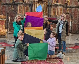 Einige Kommunionkinder der Pfarrei Sankt Dionysius Kruft haben die Botschaft von Jesus in die heutige Zeit übertragen. Ausgehend vom Sonntagsevangelium der ungleichen Brüder veranschaulichten sie mit einigen Katechetinnen und ihrem Pastor Norbert Missong die Vielfalt und das Miteinander der Farben eines Regenbogens. Und nicht nur im Leben der Kinder ist Gemeinschaft wertvoller als Neid, was sich durch das Mitgestalten der Kinder in der Vorabendmesse entfaltete.
