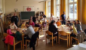 Jacqueline Maibach organisierte ein Bastelevent, wobei die Kinder mit Scheren und Kleber bewaffnet, Ihre eigenen "Osterhasentüten" herstellen konnten. Diese wurden dann mit dem eigenen Namen versehen und im AWO-Raum "geparkt".