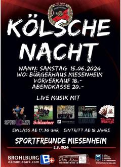 Die Sportfreunde Miesenheim feiern eine Kölsche Nacht zum 100-jährigen Bestehen. „Feste soll man bekanntlich feiern, wie sie fallen“, so heißt es im Song von Chris Roberts. Die Sportfreunde Miesenheim wollen genau dies in ihrem Jubiläumsjahr mit Euch tun.