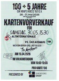 Sichert euch eure Tickets für nur 10 € (bis 10 Jahre ist der Eintritt frei) schon beim Kartenvorverkauf am 18.04.2026 von 10:00 Uhr-13:00 Uhr am DJK-Büdchen im Vulkanstadion in Kruft. Hier ist für einen Kaffee und das ein oder andere kalte Kölsch bestens gesorgt. Also die perfekte Gelegenheit, sich Tickets zu sichern und schon ein wenig Stadionluft zu schnuppern.