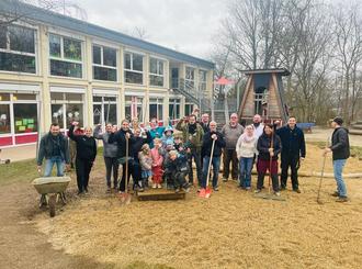 Dank der Hartnäckigkeit des EA konnten letztendlich Bürokratie und fehlende Flexibilität überwunden werden, so dass nun, über ein Jahr später, der neue Fallschutz in Form von Kies geliefert werden konnte. Nach einem gemeinsamen Aufruf von KiTa und EA konnte so kürzlich mithilfe von Eltern, Jugendlichen, Kindern und Erzieher/innen der Kies verteilt werden.