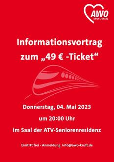 KRUFT. Der AWO Ortsverein Kruft/Kretz lädt alle Interessierten zum Informationsvortrag zum Thema 49€-Ticket alias Deutschlandticket ein. Der Vortrag findet am Donnerstag, 04. Mai 2023 um 20:00 Uhr im Saal der ATV-Seniorenresidenz Pellenz, An der Badkaul, in Kruft statt.