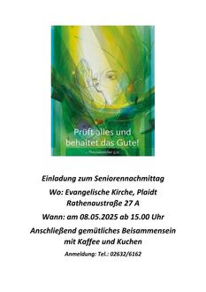 Seniorennachmittag am 8.5., um 15:00 Uhr. Anmeldungen bitte frühzeitig unter Tel.: 01512 1388241 oder E-Mail an plaidt@ekir.de