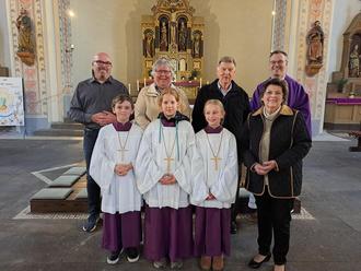 Pfarrgemeinderatsmitglieder Cornelia Praml als Fotografin, (von links) Joachim Praml, Elisabeth und Horst Schmitz, Monika Leinz und Pfarrer Norbert Missong sowie die Ministranten (von links) Robin Hörz, Leandra Bonn und Edda Griese in der Pfarrkirche Sankt Arnulf.