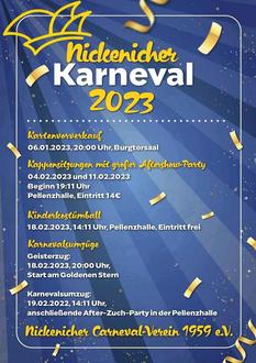 NICKENICH. Nach dem sehr guten Kartenverkauf am 6.1.2023 sind beide NCV Kappensitzungen bereits so gut wie ausverkauft! Wenige Restkarten sind noch erhältlich. Diese können in Schnorpfeil's Backstube (Hauptstr. 69) zum Preis von 14,- € pro Karte erworben werden.