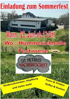Der Sommer ist da und mit ihm die perfekte Gelegenheit, einen Tag voller Freude, Gemeinschaft und Geselligkeit zu verbringen. Die St. Petrus Nachbarschaft Plaidt lädt herzlich ein zum diesjährigen Sommerfest, welches am Samstag, den 28.06.2025 auf der Festwiese der Hummerichhalle stattfindet. Beginn ist um 12:00 Uhr. Der Vorstand würde sich freuen, wenn viele Nachbarinnen und Nachbarn auf einen kleinen Schwatz vorbeikommen würden. Natürlich wird das leibliche Wohl nicht zu kurz kommen. Wie gewohnt, gibt es Kaffee und Kuchen sowie Leckeres vom Grill. Unsere jüngsten Besucher können sich auf ein Kinderparadies mit Hüpfburg, Schmink- und Spielstation freuen. Das Sommerfest ist die perfekte Gelegenheit, alte Freunde wiederzutreffen und neue Bekanntschaften zu schließen.