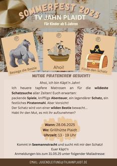 Diesmal heißt es: Leinen los und volle Fahrt voraus! Der TV Jahn Plaidt lädt seine jüngeren Vereinskids zu einem kunterbunten Piratenabenteuer ein, das garantiert für leuchtende Augen und jede Menge Spaß sorgt!