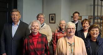 Pfarrgemeinderatsvorsitzender Horst Schmitz und einige Gläubige zusammen mit Pfarrer Norbert Missong an der Gedenktafel in der Sankt Arnulf Pfarrkirche in Nickenich.