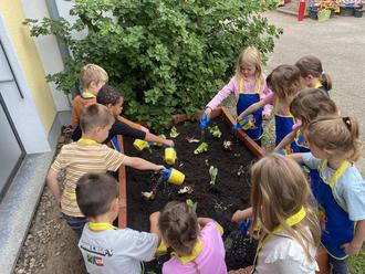 Alte Pflanzen wurden entsorgt, Erde aufgeschüttet und neue Nutzpflanzen ins Beet eingepflanzt. Wenn alle Pflanzen gut anwachsen, freuen wir uns schon bald über leckere Radieschen, Möhren, Kohlrabi, Gurken und Lollo Rosso.