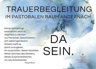 Darüber hinaus möchten wir aber gerne auch auf unser Angebot der Trauerbegleitung hinweisen. Ausgebildete Trauerbegleiter*innen stehen Ihnen bei Bedarf und nach Absprache zur Verfügung. Weitere Informationen dazu finden Sie auf unserer Internet-Seite unter www.pr-andernach.de.