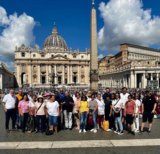 Knapp 50 Mitarbeitende aus der BBT-Region Koblenz-Saffig haben vom 18. - 22. Mai eine gemeinsame Wallfahrt nach Rom unternommen. Höhepunkte der Reise waren die Teilnahme an der Audienz mit Papst Franziskus, die Besichtigung des Petersdoms und eine geistliche Entdeckungsreise entlang unbekannterer Kirchen in Rom. Neben Führungen durch die ewige Stadt und gemeinsamen Gottesdiensten, beinhaltete das Programm auch Blicke hinter die Kulissen des Vatikans. Hierzu zählte eine Führung über einen deutschsprachigen Friedhof, wo sich sogar Verbindungen zur Einrichtung der Barmherzigen Brüder Saffig erkennen ließen: Eine ehemalige Ordensschwester aus Münstermaifeld fand hier ihre letzte Ruhe. Der letzte gemeinsame Abend wurde zudem für einen Auslug vor die Tore von Rom genutzt, bei dem man den malerischen Ort Frascati kennenlernte.