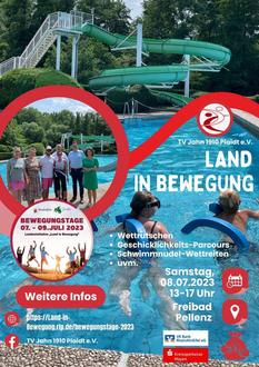 Am Samstag, den 08.07.2023 findet im Rahmen der Landesinitiative „Land in Bewegung“ auch in Plaidt Bewegung statt. Als Teil der Initiative richtet der TV Jahn Plaidt an diesem Tag ein abwechslungsreiches Programm im Freibad Pellenz aus. Beginn der Veranstaltung ist um 13 Uhr.