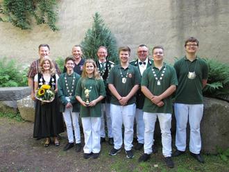 Ralph Thiele, Schützenkönigin Monika Thiele, Schülerprinz Adrian Reinhardt, Feuerwehrkönig Matthias Schneichel, Bambiniprinzessin Mila Schander, Scheibenkönig Frank Wieczorek, Jugendvogelprinz Jan-Luca Glinka, Brudermeister Hohenstein, Jugendscheibenprinz Colin Moldaner, Bezirksprinz Dominik Merz