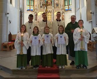 Anfang Juli war es nun soweit: Die Neulinge wurden in einem festlichen Gottesdienst der Gemeinde vorgestellt und offiziell in die Messdienergemeinschaft aufgenommen. Als Zeichen dafür überreichte Pastor Kurp jedem eine Urkunde. Alle Neulinge sind sehr engagiert bei der Sache und haben viel Freude bei ihrer neuen Aufgabe.