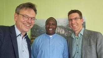 Foto: Pastor Norbert Missong von der Pfarreiengemeinschaft Kruft-Nickenich, Pastor Aloyce Urio und Verbandsbürgermeister Sebastian Busch.