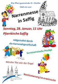 SAFFIG. Am Sonntag, 28. Januar um 11 Uhr findet in der Pfarrkirche die Saffiger Narrenmesse statt. Die Pfarrgemeinde St. Cäcilia lädt alle Familien mit Kindern, sowie die ganze Karnevalsgesellschaft und alle anderen Närrinnen und Narren herzlich ein.