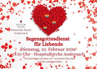 Der Pastorale Raum Andernach lädt alle Liebenden herzlich zu einem Segensgottesdienst am Dienstag, 10.02.2026 um 19:30 Uhr in die Hospitalkirche (St. Nikolaus Stift-Hospital) Andernach ein. Neben Gottesdienst und Gottes Segen erwartet Sie schöne Musik und ein Glas Sekt. Seien Sie uns willkommen, um gemeinsam die Liebe - egal welchen Alters - zu feiern.