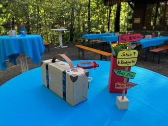 Die Eltern hatten in der Zwischenzeit die Grillhütte toll vorbereitet. Tische und Bänke waren gerichtet, der Grill war bereit, die Tische toll geschmückt mit selbstgebasteltem von einer Mutter und jeder hatte leckere Köstlichkeiten zu einem Buffett beigetragen. Sogar eine Seifenblasenmaschine begrüßte die Kinder und sorgte für Spielvergnügen.