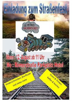 PLAIDT. Dieses Mal soll es klappen! Nachdem die St. Petrus Nachbarschaft pandemie-bedingt die Jubiläumsfeier zum 90-jährigen Bestehen leider absagen musste, wird in diesem Jahr ein Straßenfest für alle Nachbarinnen und Nachbarn, Freunde und Verwandte stattfinden, und zwar am Samstag, den 12.08.2023 ab 11:00 Uhr auf dem Parkplatz vom Hotel Geromont.