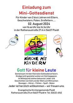 Mini-Gottesdienst für Kinder von 2-6 Jahren am 02.08. von 16 - 16.30 Uhr