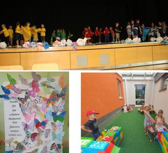 Die zukünftigen Schulkinder ließen es ja bereits 2 Wochen zuvor im Piratenland und mit Spiel und Spaß in der Kita so richtig krachen. Doch fehlte noch ein festlicher Abschluss gemeinsam mit allen Eltern in der Hummerichhalle. Dort versammelten sich am 27.06.2025 alle um die Verabschiedung der „Großen“ gebührend zu feiern. Auf diesen Tag freuten sich die Kinder ganz besonders, da es endlich die lang ersehnten Schultüten für sie gab. Die Andacht zusammen mit Diakonin Jutta Schulz von Dratzig gestaltete sich nach dem Motto: „Bunt statt Einfarbig“. Denn ein ganzes Jahr beschäftigten sich die Vorschulkinder in ihren AGs mit dem Thema Kunst und Farben und erschufen tolle Kunstwerke. An diesem Nachmittag inszenierten sie selbst ein buntes Kunstwerk der Farben auf der Bühne und spielten in Begleitung von Musik das Buch: „Das Vierfarbenland“ kurz nach.