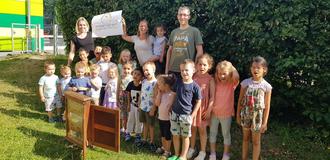 Er beantwortete die Fragen der Kinder, zeigte die benötigten Werkzeuge, einen Imkeranzug und verdeutlichte die Wichtigkeit des kleinen Tierchens sowie einer artenreichen Umwelt. Auch ein Glas Honig zum Probieren für alle hatte er dabei. Eine weitere Überraschung erwartete die Gruppe im Außenbereich.
