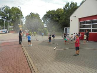 Für die Schukis der Kita "Arche Noah" stand ein Besuch bei der Feuerwehr in Plaidt an: Die Feuerwache sowie ein Feuerwehrauto durften inspiziert werden. Zum Abschluss konnte jeder einmal den Feuerwehrschlauch testen und sich in einer großen Wasserfontäne abkühlen.