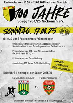 Das Jubiläumswochenende der Spvgg 1904/25 Nickenich geht in die nächste Runde - und der Sonntag steht ganz im Zeichen von Tradition, Gemeinschaft und sportlicher Zukunft!